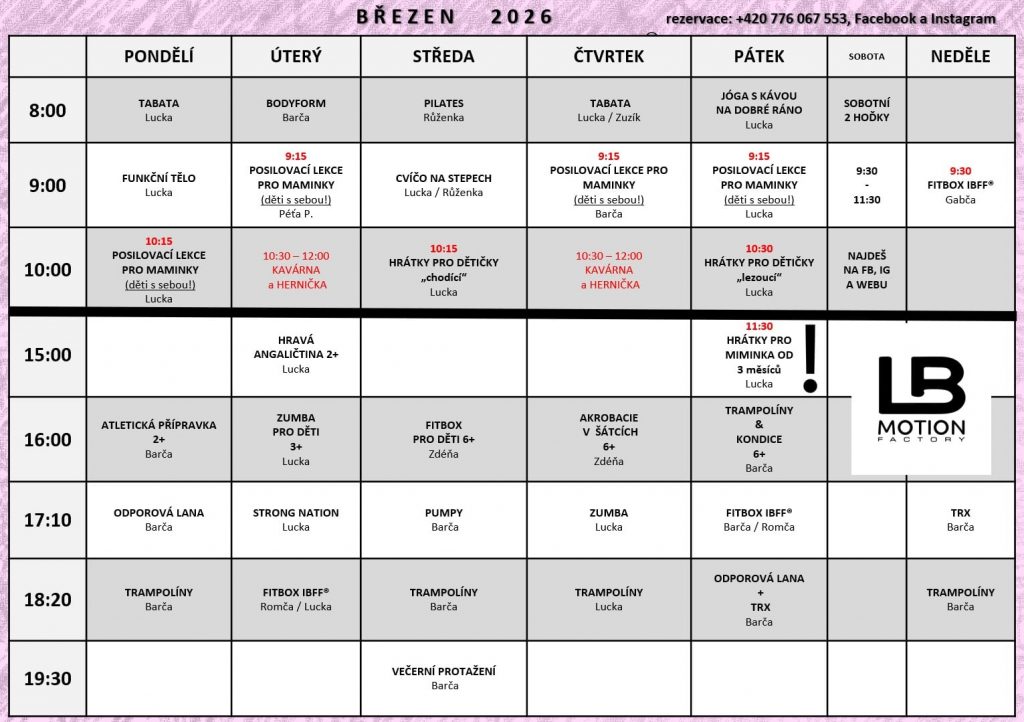 Rezervace na telefonním čísle 776067553, či Facebooku nebo Instagramu – kapacita některých lekcí (trampolíny, lana, šátky).